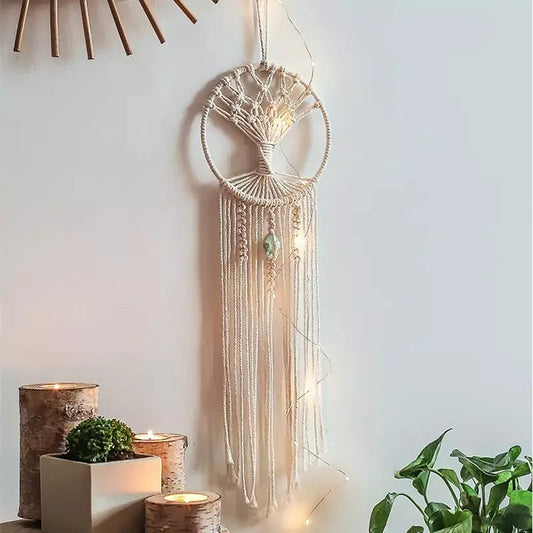 If you are looking for a dream catcher to hang by your bed and are sensitive to the multiple protective benefits it can bring to the quality of your sleep, discover our Macrame moon dream catcher. These adorable creations will give you a feeling of calm and comfort. Choose a soft and subdued light to get the coziest result possible.